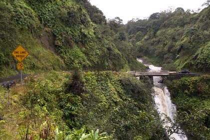 Waterfalls in the path of road to Hana. Maui. Hawaii. Oheo Pools Gulch Hana Highway Mount Haleakala Maui Hawaii Pacific Ocean. The Hana Highway is a 64.4-mile (103.6 km) long stretch of Hawaii Routes 36 and 360 which connects Kahului with the town of Hana in east Maui.