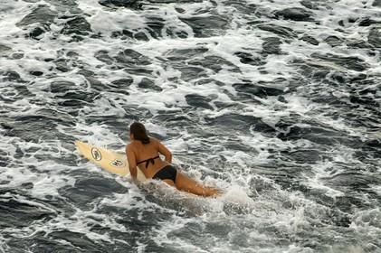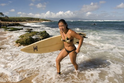 Woman surfer. Honolii beach where most practitioners to surf are women, there is even a school, the Big Island Surf Girl, which gives lessons to the novices. Big Island. USA.