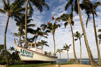 Mama’s Fish House Restaurant. Ho’okipa Beach Park. Maui. Famous Mamas Fish House with palms and beach in Maui Hawaii.