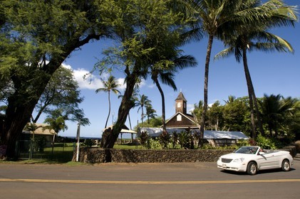 White convertible car in front of Kalaeala’i Congregational Church. Makena. Maui. Hawaii. Keawala’i Congregational Church founded in 1832 on Hawaii’s island of Maui.