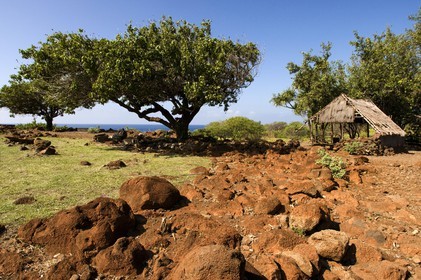 Lapakahi State Historical Park, where Hawaiian fishermen lived for centuries until the place was left without water. Big Island. Hawaii. USA. Renovated structure of a home at a 600 year old Hawaiian settlement.