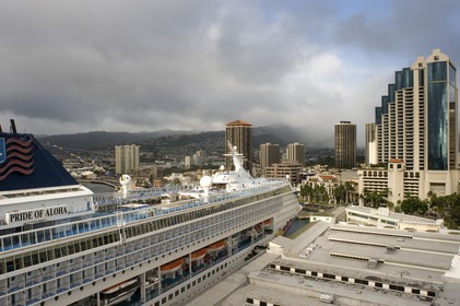 Cruise ship moored in the port of Honolulu. O'ahu. Hawaii. Pride of Aloha. Boat cruises around Hawaii give visitors the chance to tour more than the one or two islands they'd normally visit on a typical Hawaiian vacation.