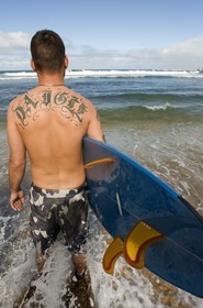 Surfer on the beach Ali'i Beach Park. Haleiwa. O'ahu. Hawaill. Ali’i Beach Park consists of a main western section and a small eastern section that is wedged inside the Hale’iwa Harbor breakwater.