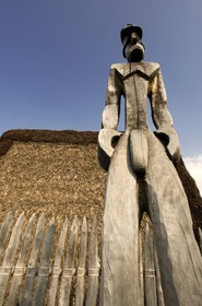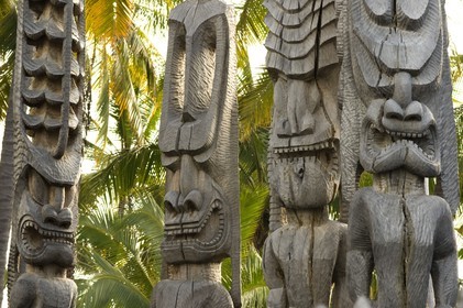 Pu'uhonua O Honaunau National Historic Park, Hale O Keawe reconstructed temple with wood carvings, South Kona Coast, Big Island. Ki'i totem images wood