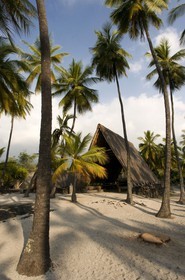 Pu'uhonua O Honaunau National Historic Park, Hale O Keawe reconstructed temple with wood carvings, South Kona Coast, Big Island.