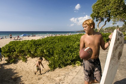 Hapuna Beach, one of the 100 best beaches in the world as ranked by some of the guidebooks. Big Island. Hawaii. USA. Boy with a bodysurf and rugby ball.
