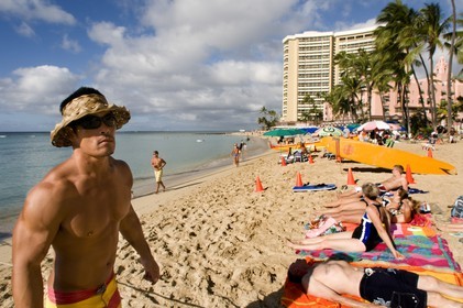 Sunbathing on the beach of Waikiki Beach. O'ahu. Hawaii. Waikiki is most famous for its beaches and every room is just two or three blocks away from the sea.