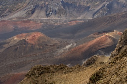 Cinder cones in the Haleakala National Park. Views from the viewpoint of Leleiwi. Maui. Hawaii. The Haleakala National Park ranges through five distinctly different climates zones. The road to the Haleakala summit, known as the Haleakala Highway, holds the world record for climbing to the highest elevation in the shortest distance of 38 miles.