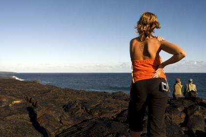 Black lava mountains near the coast and highway Chain of Crater Road. Hawai'i Volcanoes National Park. Big Island. Hawaii. Woman with a tattoo.