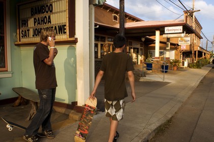 Skaters in Hawi. Hawi is the most northern town. Wooden houses painted in bold colors transform you into an atmosphere of the seventies, when the town was a thriving place dedicated fully to the sugarcane. Big Island. Hawaii. USA.