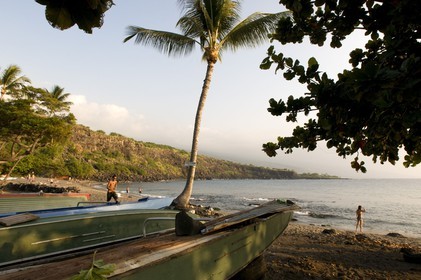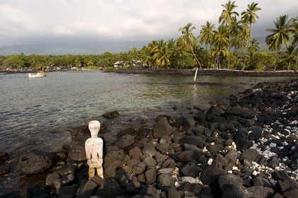 Pu'uhonua O Honaunau National Historic Park, Hale O Keawe reconstructed temple with wood carvings, South Kona Coast, Big Island. Ki'i totem images wood, near water warned that the dock canoes on the beach was for the exclusive use of the head and his assistants.