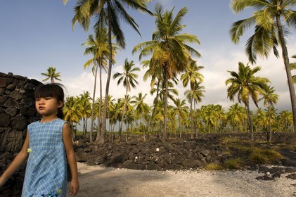 Asian girl in the Royal Gardens. Pu'uhonua o Honaunau National Historic Park. Big Island.