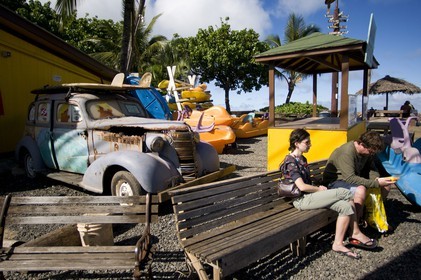 Kohala Bamboo Restaurant and Bar in Hawi. Nisan 370Z. Hawi is the most northern town. Wooden houses painted in bold colors transform you into an atmosphere of the seventies, when the town was a thriving place dedicated fully to the sugarcane. Big Island. Hawaii. USA. The small rural town of Hawi, Highway 270, North Kohala District, Hawaii USA.