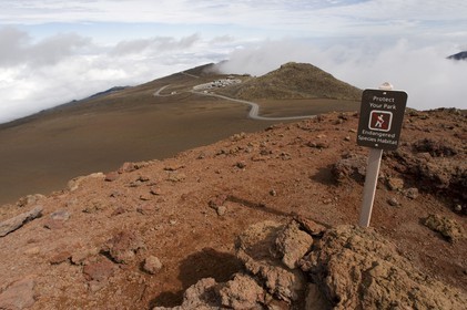 Haleakala National Park. Views from the viewpoint of Leleiwi. Maui. Hawaii. The Haleakala National Park ranges through five distinctly different climates zones. The road to the Haleakala summit, known as the Haleakala Highway, holds the world record for climbing to the highest elevation in the shortest distance of 38 miles.