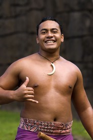 Central show in one of the lakes called Rainbown of Paradise where canoes parade singing songs, dances and martial arts in each country, in this case a resident of Samoa, wearing a skirt called lavalava. Polynesian Cultural Center. O'ahu. Hawaii.