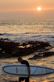 Surfer at sunset on the beach in Waikoloa. Big Island. USA. Surfers in the coral and lava flank Anaeho'omalu Bay in Hawaii. Waikoloa Beach is an area located on the South Kohala coast on the island of Hawaii and is located in the census-designated place of Puako.