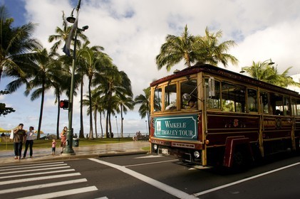 Waikiki Trolly, tourist bus shopping that runs between Waikiki and Honolulu. O'ahu. Waikiki Trolley Trolley is an Oahu-based transportation company that shuttles Hawaii visitors and local passengers throughout Waikiki, Honolulu and East Oahu on four separate lines.