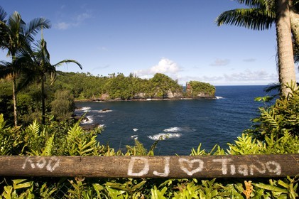 Wai'anapanapa State Park. A leafy location with sea caves and volcanic cliffs. Hana Highway. Maui. Hawaii. This is a great stop in the Road to Hana. Beautiful vistas, black sand beaches, hiking and ample parking.