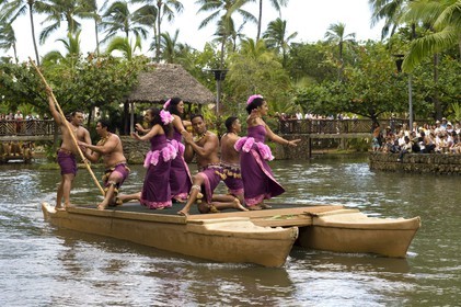 Canoe navigating the canal running through the park. Polynesian Cultural Center. O'ahu. Hawaii. Polynesian Cultural Center. O'ahu. Hawaii.