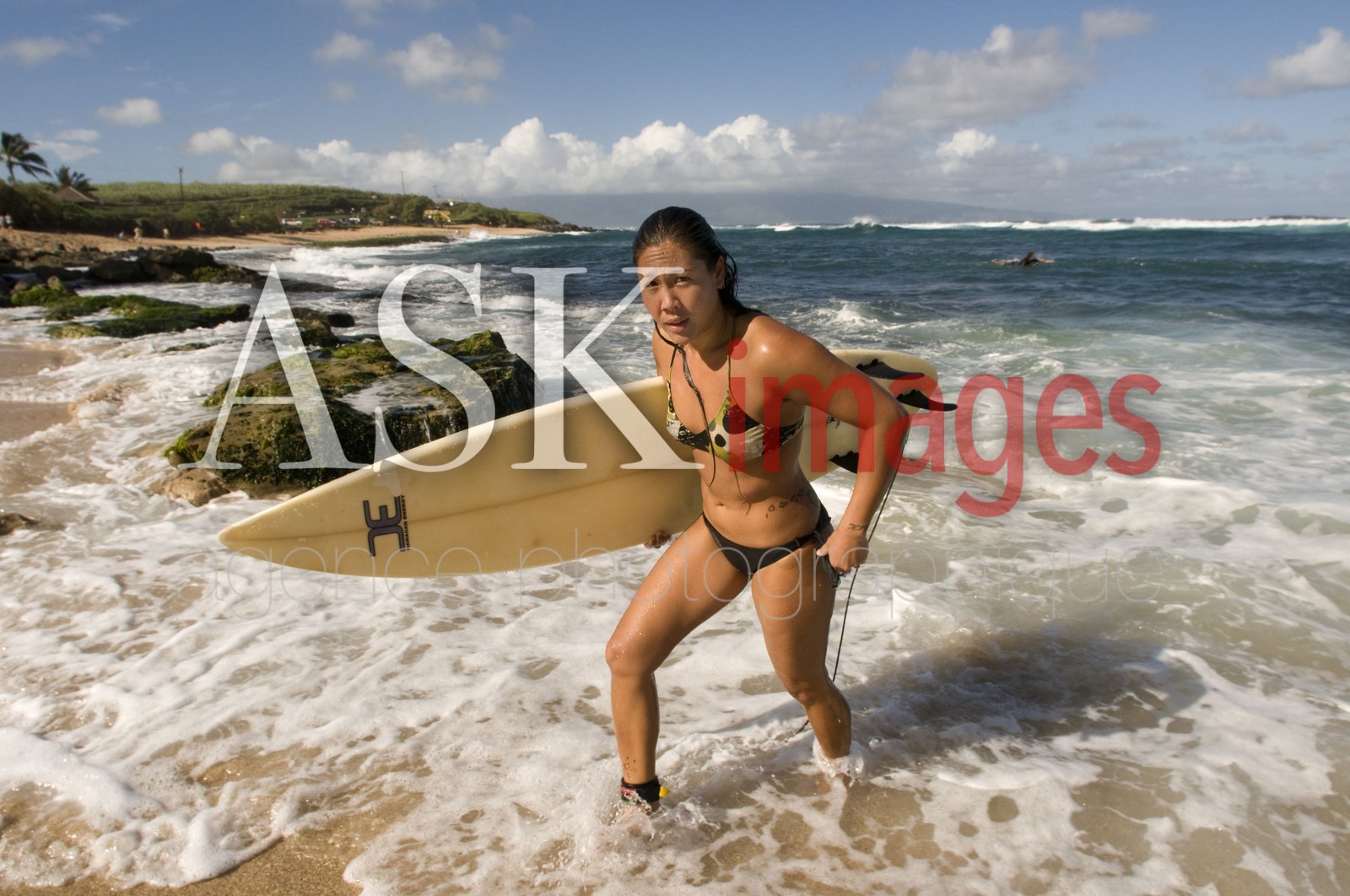 DescriptionWoman Surfer leaving the water. Ho’okipa Beach. Maui. Hawaii. One of the world’s best windsurfing beaches, Hookipa is also a favorite hangout for kitesurfers and surfers as well as other water sports enthusiasts.