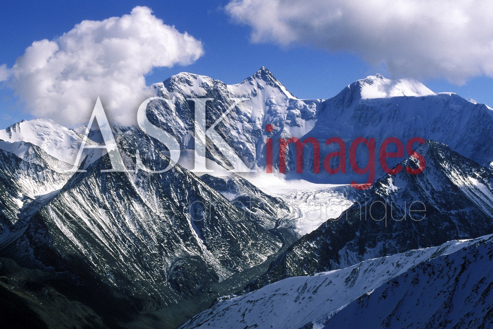 | Description | Altai Mountains, Katunskiy Ridge with panorama on Mt.Belukha (4506m), the highest in Siberia, with many peaks and glaciers, end of September, Russia |